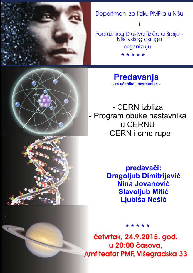 U četvrtak, 24. septembra, na Prirodno-matematičkom fakultetu u Nišu biće održano nekoliko zanimljivih predavanja o Evropskoj organizaciji za nuklearna istraživanja (CERN). Teme predavanja su: